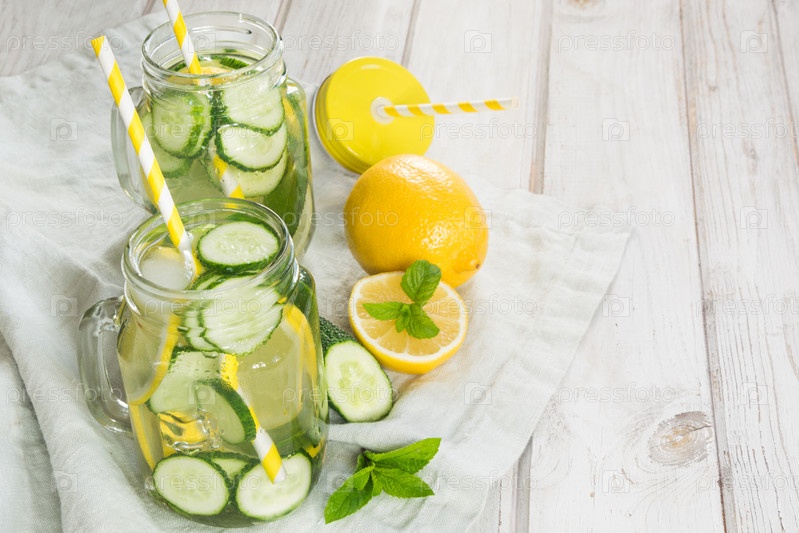 Летний освежающий коктейль с лимоном, огурцом, мятой и льдом