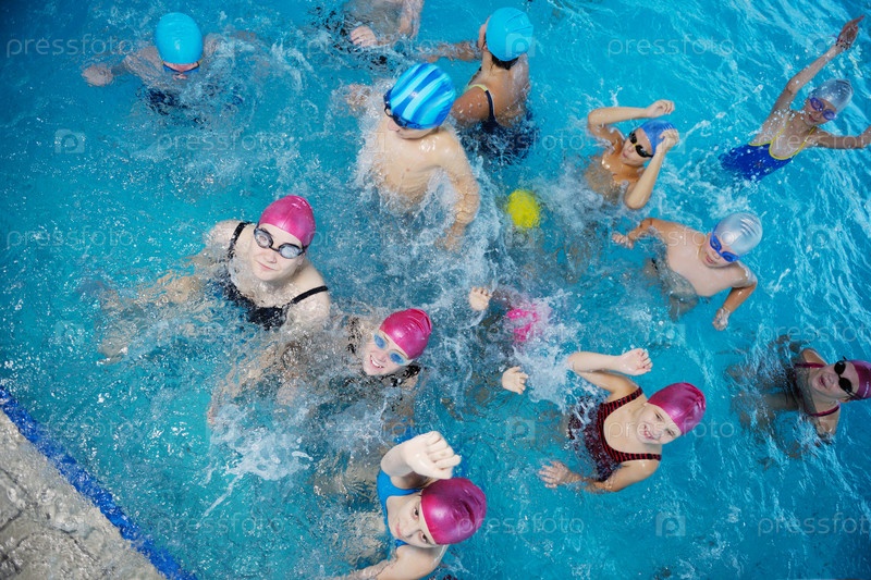 Группа счастливых детей в плавательном бассейне