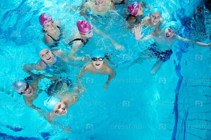 Группа счастливых детей в плавательном бассейне