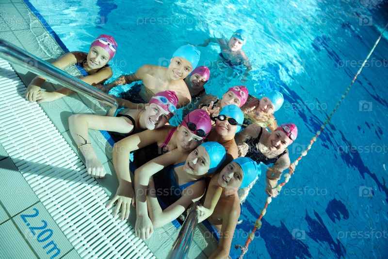 Группа счастливых детей в плавательном бассейне