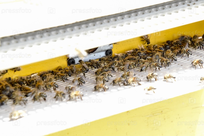 Пчелы летают у входа в улей