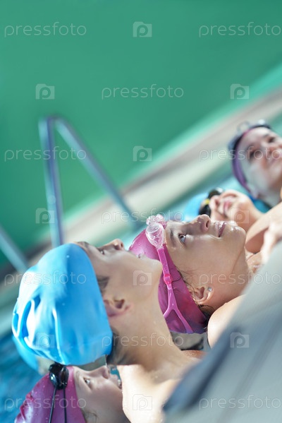 Группа счастливых детей в плавательном бассейне