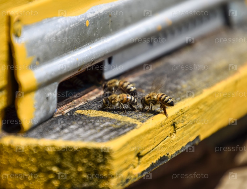 Пчелы летают у входа в улей