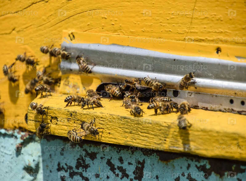 Пчелы летают у входа в улей