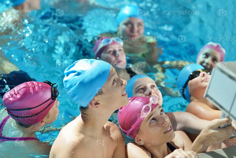 Группа счастливых детей в плавательном бассейне