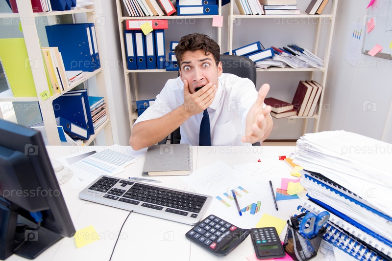 Бизнесмен, работающий в офисе с грудой книг и бумаг