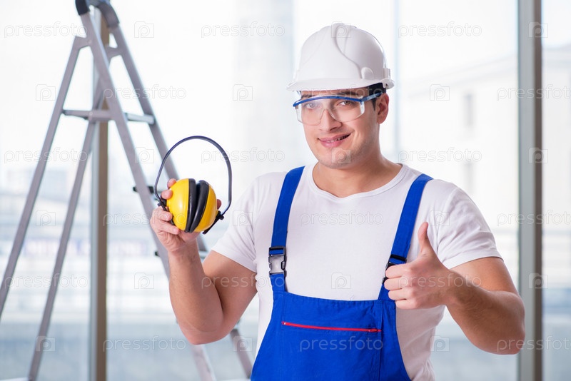 Молодой рабочий с наушниками для подавлением шума