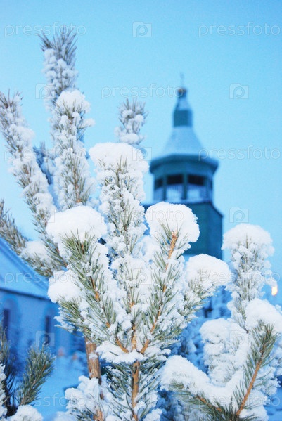 Сосна на фоне церкви вечером