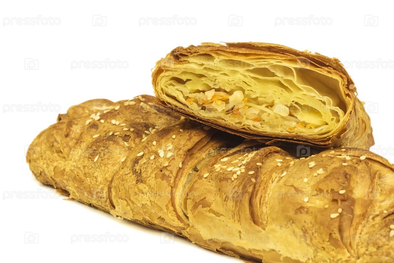 Пирог из слоеного теста с начинкой на белом фоне