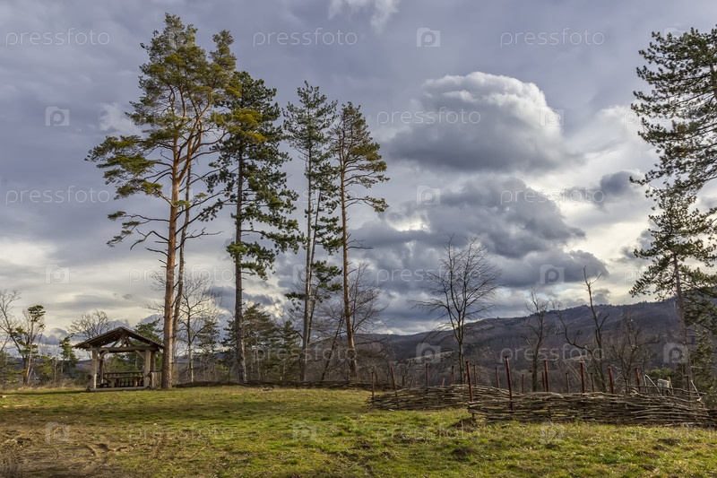 Горный пейзаж с деревянной беседкой