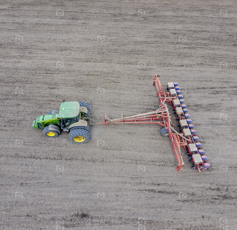 Посев кукурузы. Трактор с сеялкой на поле