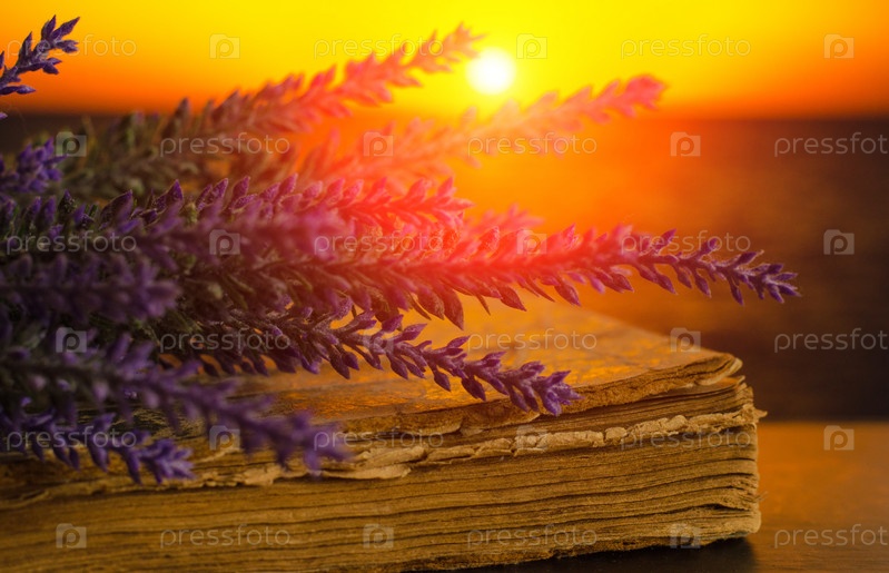 Букет лаванды лежит на старой книге на закате