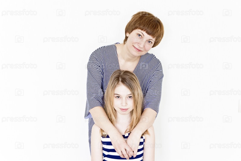 Красивая мать и дочь на белом фоне