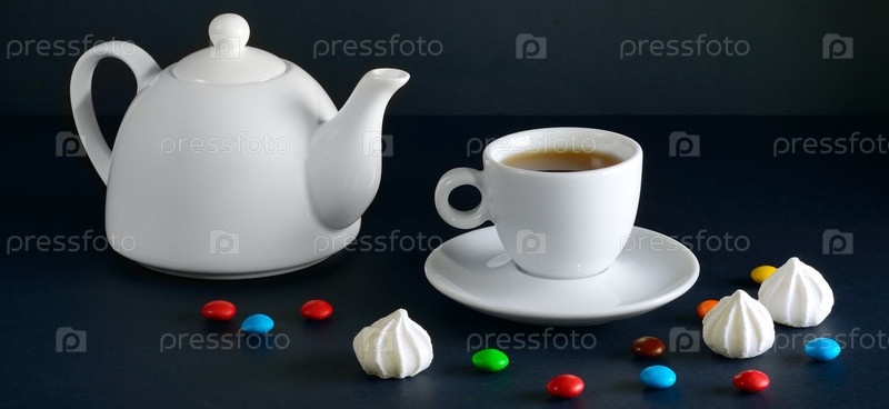 Белая чашка и чайник на черном фоне