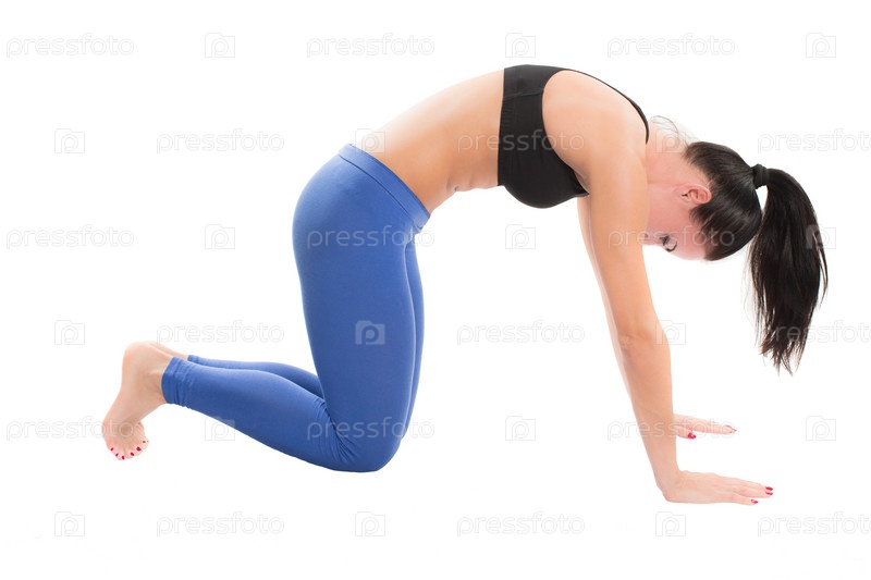 Молодая женщина делает растяжку, изолированная на белом фоне