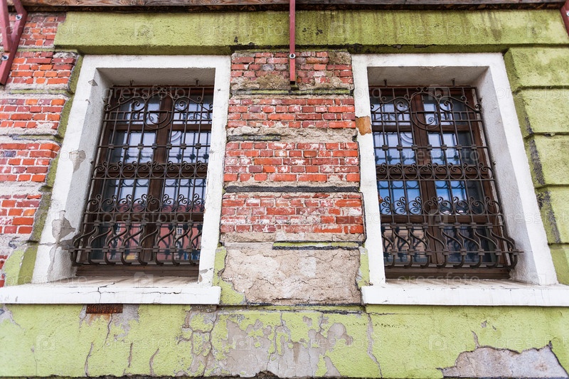 Потертая стена с окнами старого дома во Вроцлаве