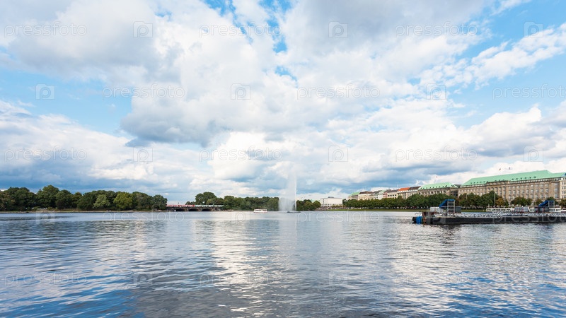 Внутренний Альстер озеро с фонтаном в городе Гамбург