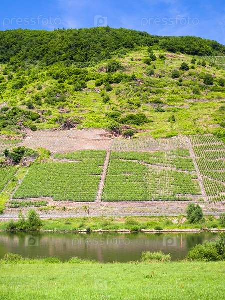 Виноградники на зеленом склоне вдоль реки Мозель