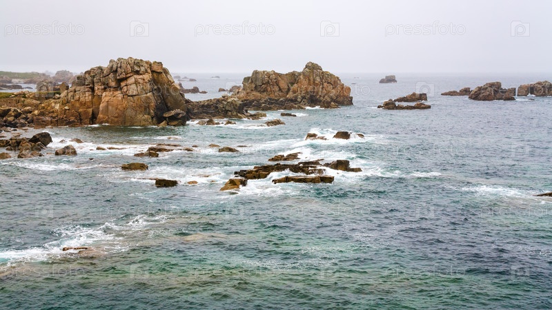 Вид скалистого побережья Бретани в дождливый день