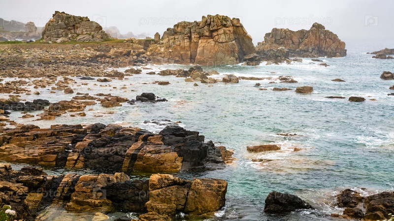 Вид скалистого берега в Бретани в дождливый день