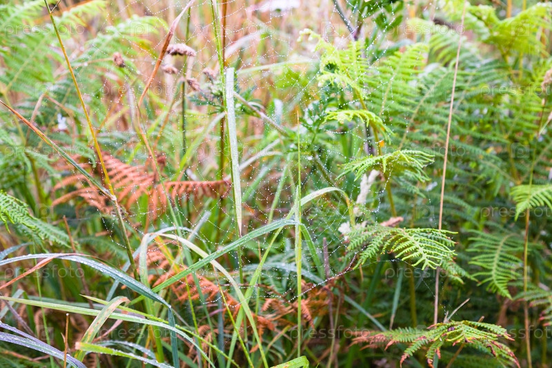 Паутина в зеленой траве на лугу