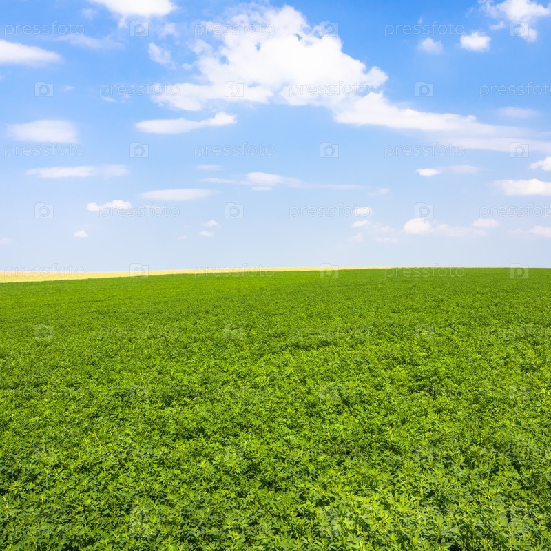 Вид зеленой люцерны поле под голубым небом