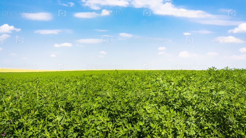 Зеленое поле люцерны под открытым небом с белыми облаками