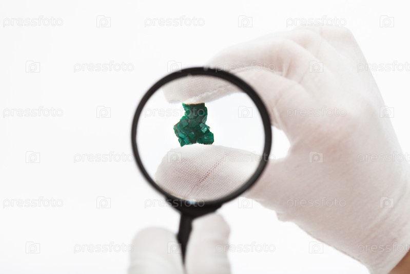 Мастер проверяет диоптаз кристалл с лупой