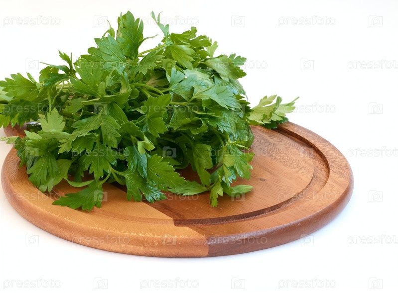 Зеленая петрушка на разделочной доске на белом фоне