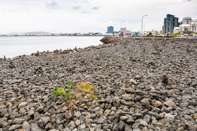 Каменный пляж на побережье Атлантического океана в городе Рейкьявик