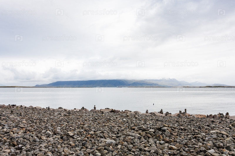 Галечный пляж с каменными пирамидами в Рейкьявике