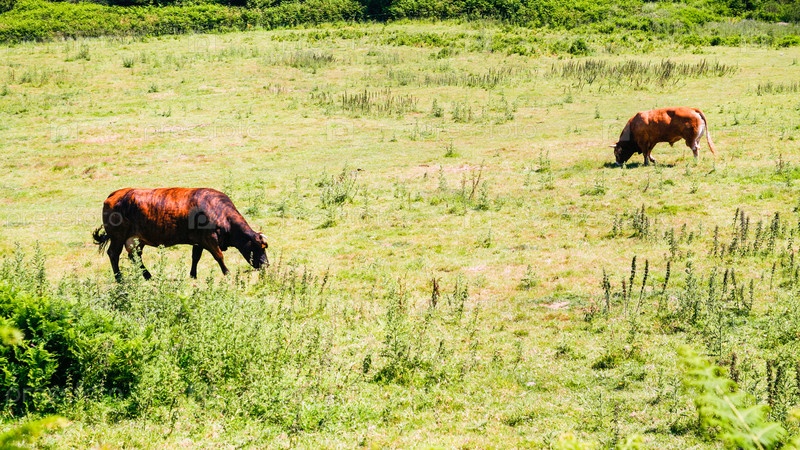 Корова и бык пасутся на зеленом лугу в Бретани