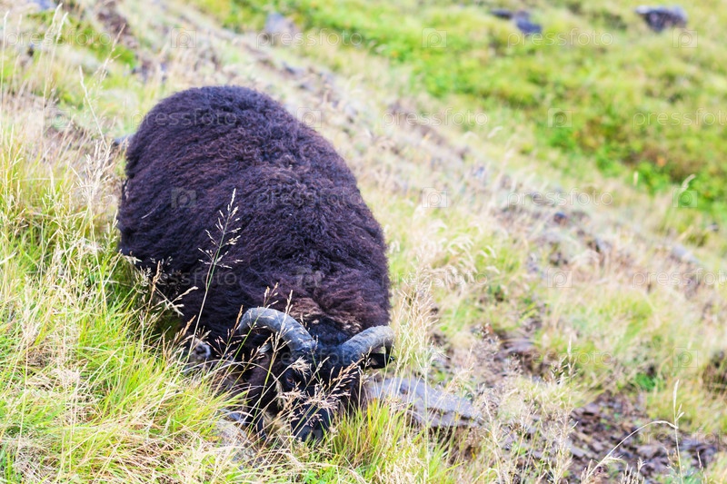 Черная овца на склоне горы в Исландии