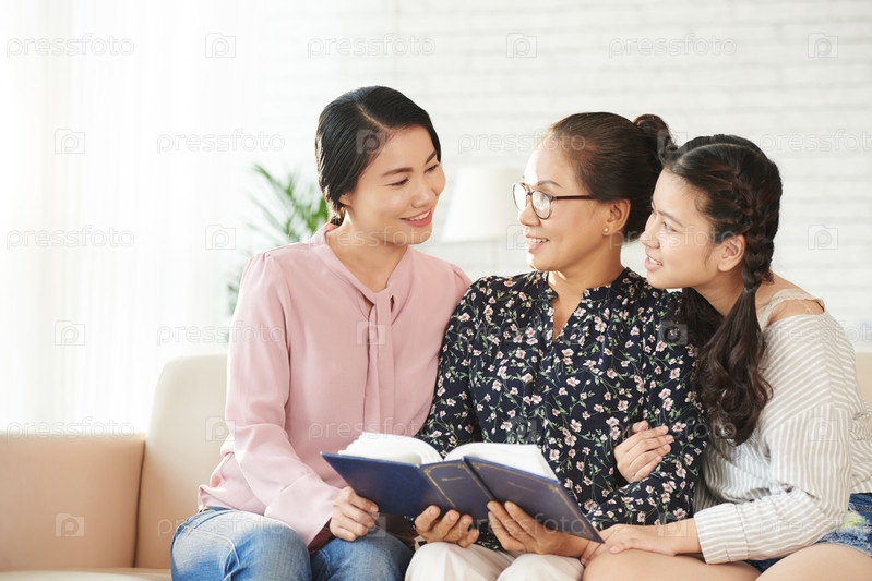 Семья смотрит на старые фотографии