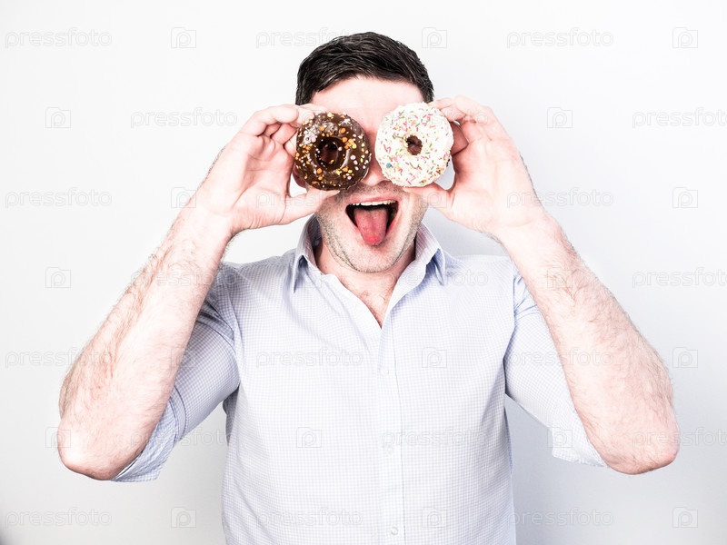Смешной счастливый парень с пончиками