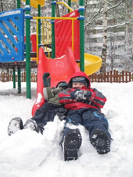 Мальчики на игровой площадке во дворе зимой