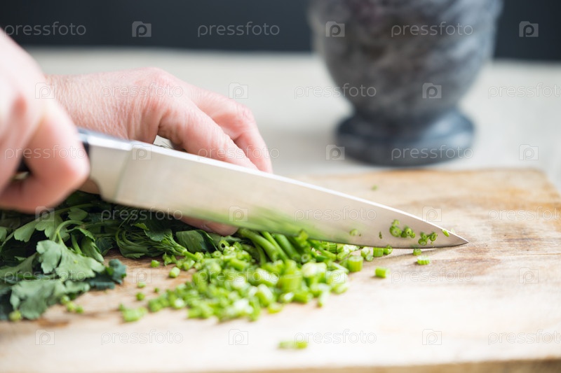 Нарезка зелени на кухонном столе