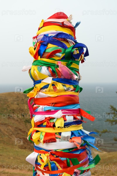 Деревянные ритуальные столбы с красочными лентами Хадак на мысе Бурхан. Озеро Байкал