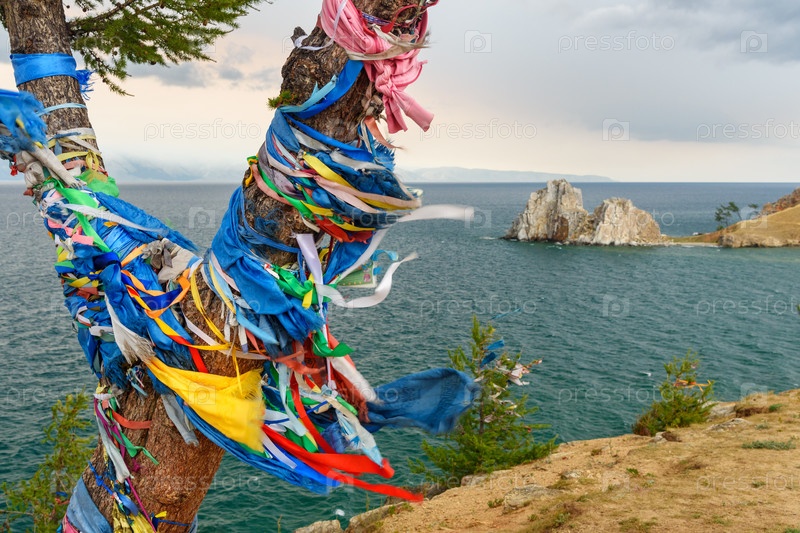 Деревянные ритуальные столбы с красочными лентами Хадак на мысе Бурхан. Озеро Байкал