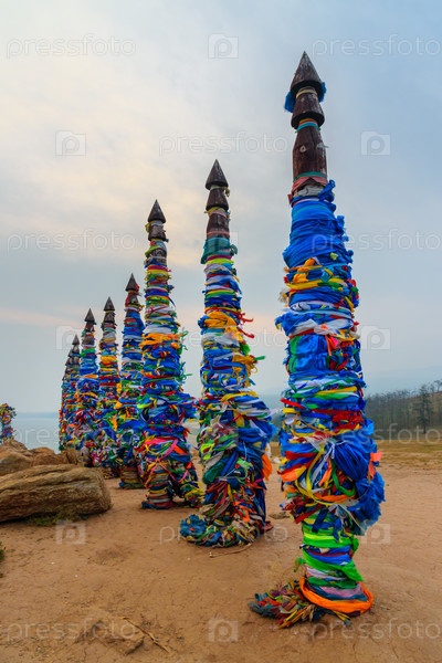 Деревянные ритуальные столбы с красочными лентами Хадак на мысе Бурхан. Озеро Байкал. Остров Ольхон. Россия