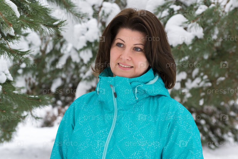 Женщина в синей куртке в заснеженном еловом лесу