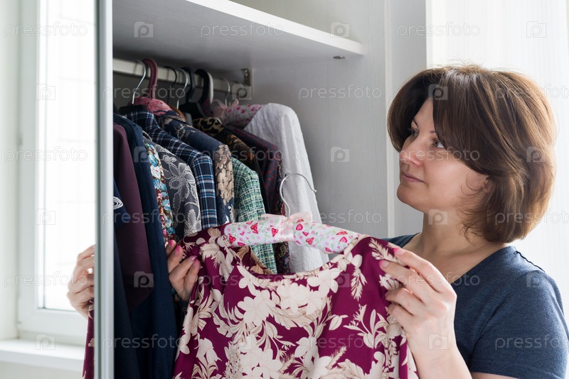 Женщина берет блузку в шкафу на вешалке