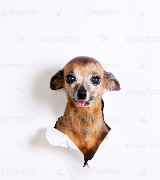 Голова старой, седой собаки в отверстии бумаги