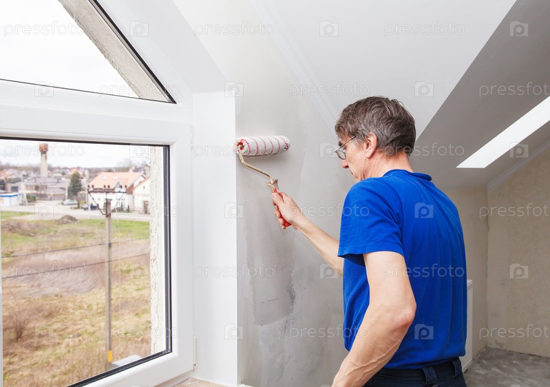 Пожилой работник мажет стены клеем