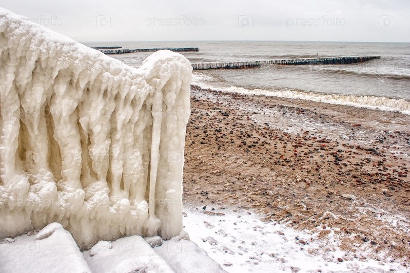 .лестница на пляже покрыта льдом