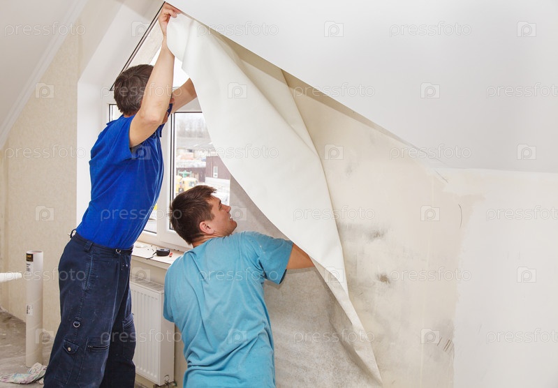 Двое рабочих клеят обои