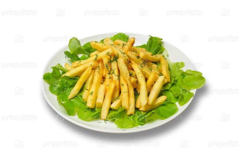 Картофель фри с листьями салата на тарелке на белом фоне