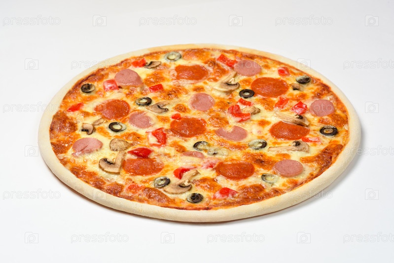 Пицца с грибами, колбасой и оливками на белом фоне