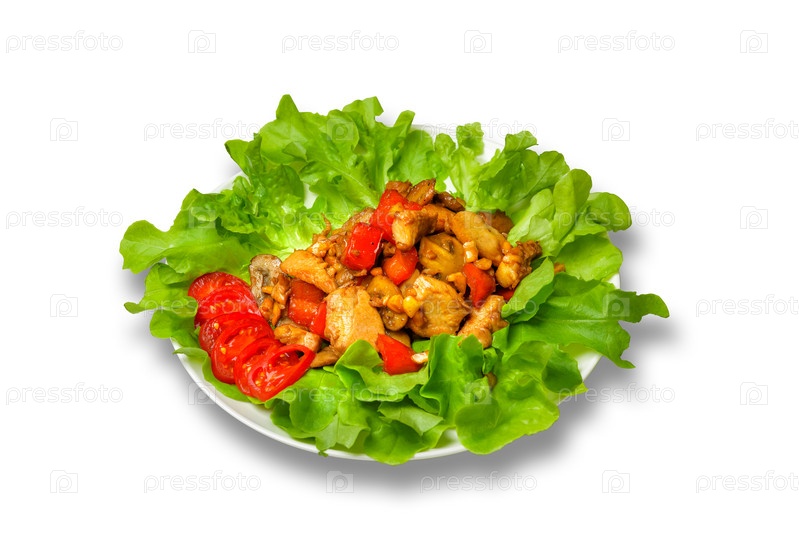 Шампиньоны с помидорами и сладким перцем с салатом на белом фоне