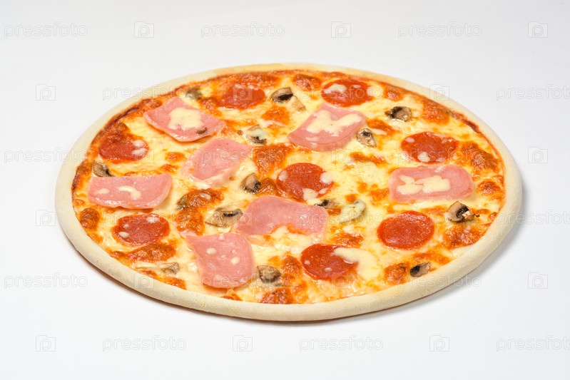 Пепперони пицца с колбасой, грибами и сыром моцарелла на белом фоне